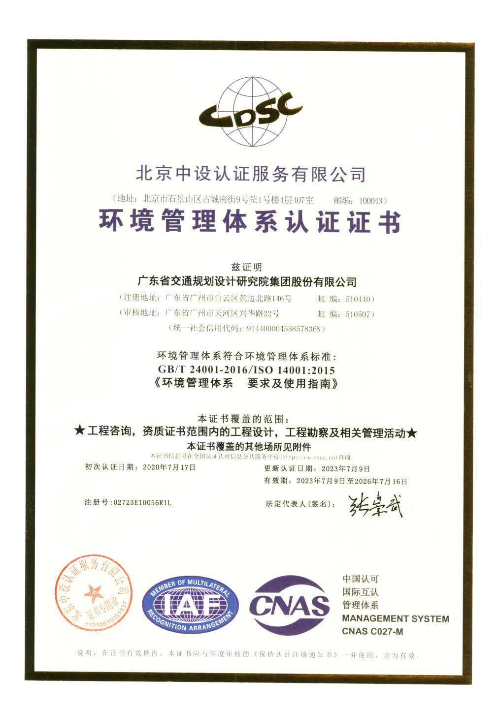 環(huán)境管理體系認證證書