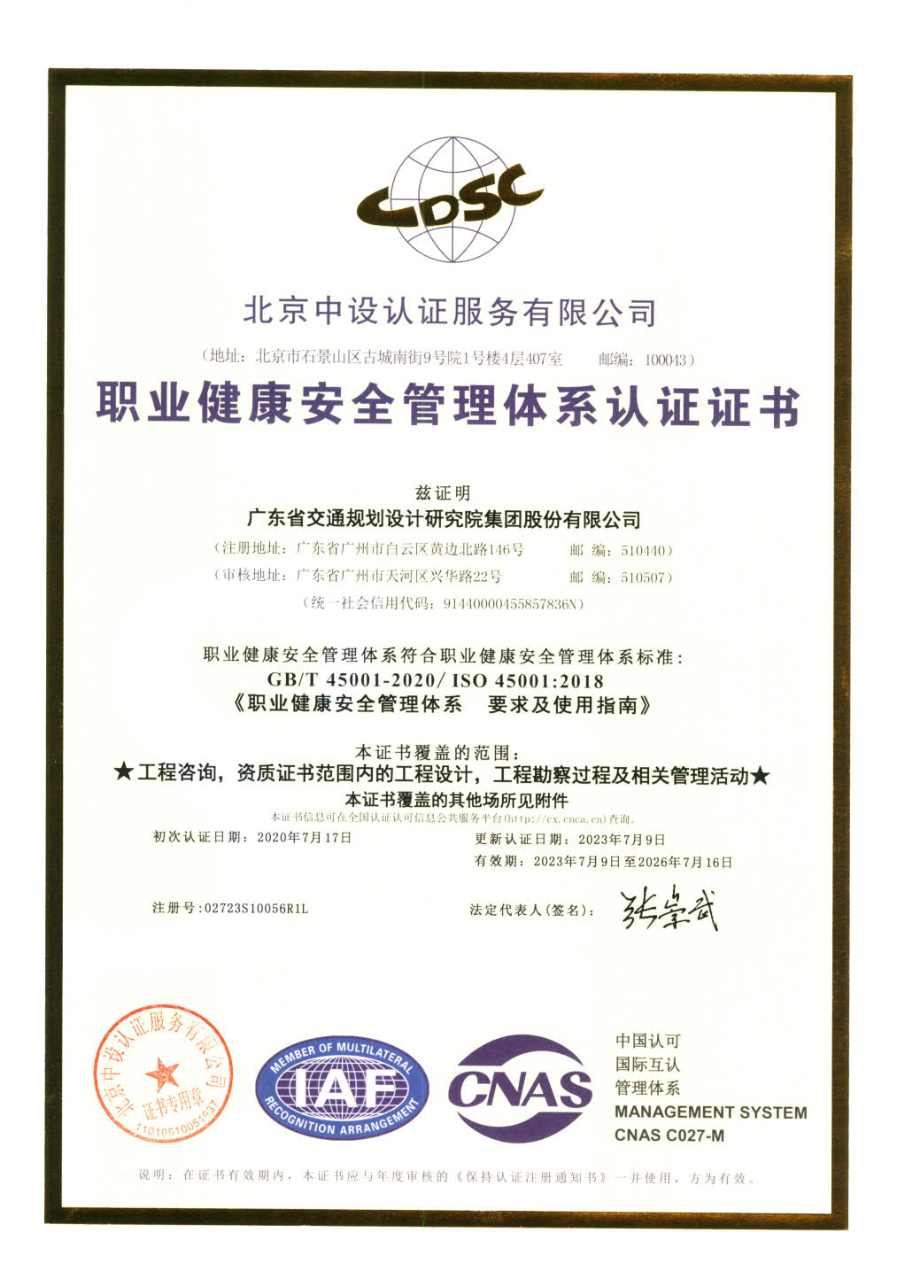職業(yè)健康安全管理體系認證證書