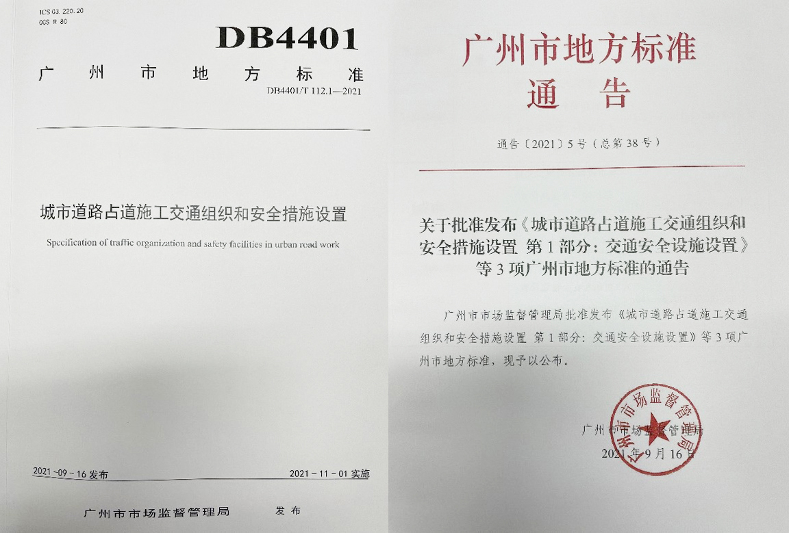 由廣州市交通運(yùn)輸局牽頭,我公司與市標(biāo)準(zhǔn)化研究院、市公安局交通警察支隊(duì)聯(lián)合編制的廣州市地方標(biāo)準(zhǔn)《城市道路占道施工交通組織和安全措施設(shè)置》(DB4401/T 1122021)于日前獲廣州市市場(chǎng)監(jiān)督管理局批準(zhǔn),并自2021111日起正式實(shí)施。