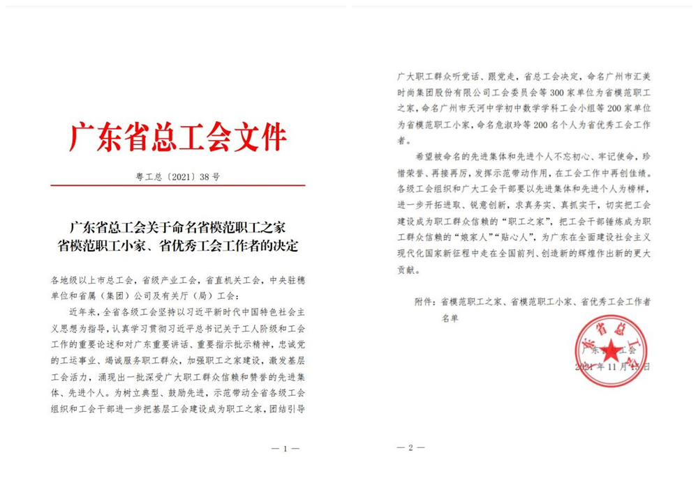 近日,從廣東省總工會(huì)傳來喜訊,我公司榮獲“廣東省模范職工之家”稱號。這是集團(tuán)公司首次獲得該項(xiàng)榮譽(yù),是對集團(tuán)公司工會(huì)圍繞中心,服務(wù)大局,切實(shí)做好職工“娘家人”、“貼心人”的肯定,特此報(bào)喜!