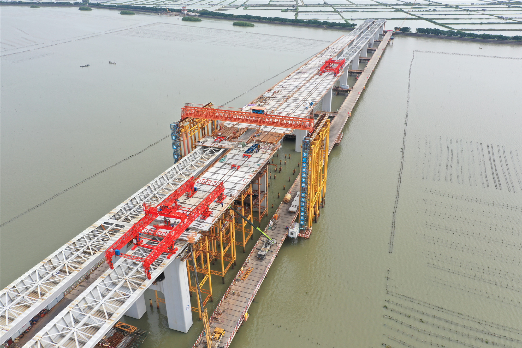 汕頭市牛田洋快速通道工程起點(diǎn)位于汕頭市城區(qū)西側(cè),路線長15.8km,主線橋梁總長14.2km。項(xiàng)目設(shè)計(jì)施工難度大,涉及抗風(fēng)、抗震、防腐、防撞、公軌合建等復(fù)雜因素。牛田洋大橋采用主跨 468m半漂浮體系雙塔雙索面鋼桁梁斜拉橋,上層公路、下層軌道斷面布置方式;軌道交通采用跨座式單軌制式。水中引橋?yàn)?span>70~80m分層布置鋼混組合梁,采用上、下層同步頂推施工方案;陸上引橋?yàn)?span>30~75m鋼混組合梁,采用雙槽型無中橫梁體系。鋼混組合梁為廣東省首次大規(guī)模采用。