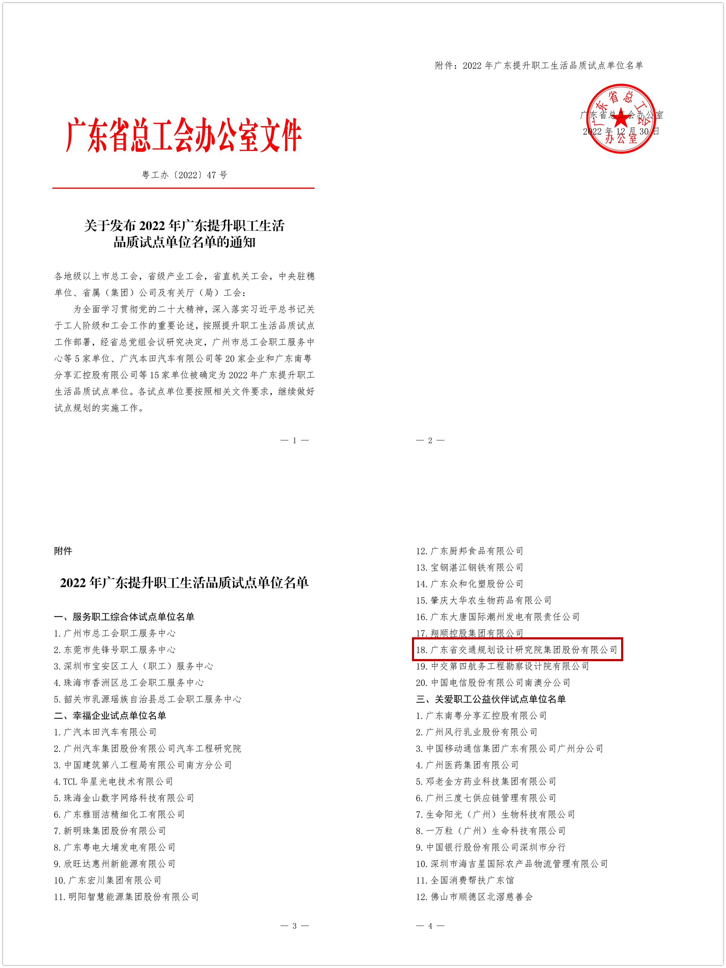近日,從廣東省總工會傳來喜訊,集團(tuán)經(jīng)廣東省交通工會推薦,報廣東省總工會評審?fù)ㄟ^,被確定為2022年廣東提升職工生活品質(zhì)(幸福企業(yè))試點單位,是廣東省交通運輸系統(tǒng)唯一入選單位(全省共20家幸福試點企業(yè))。