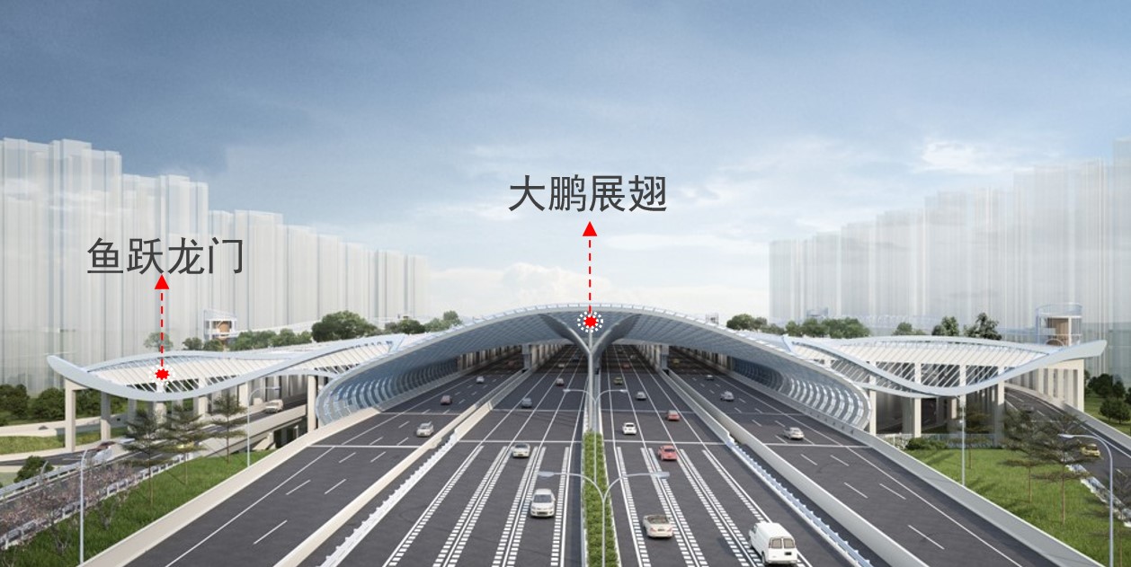 基于該項目的特點,項目組在設(shè)計過程中,除了滿足行車功能之外,也對司乘和外界人員的感官體驗進行了充分考慮:主線兩端設(shè)有“大鵬展翅”造型,彰顯廣深高速公路的灣區(qū)地位;匝道入口采用“魚躍龍門”裝飾,完美配合主線過渡,避免了單調(diào)的門洞效應(yīng);考慮到收費廣場路段車速較慢,且為封閉空間,采用“時空隧道,繁星點點”景觀照明等。