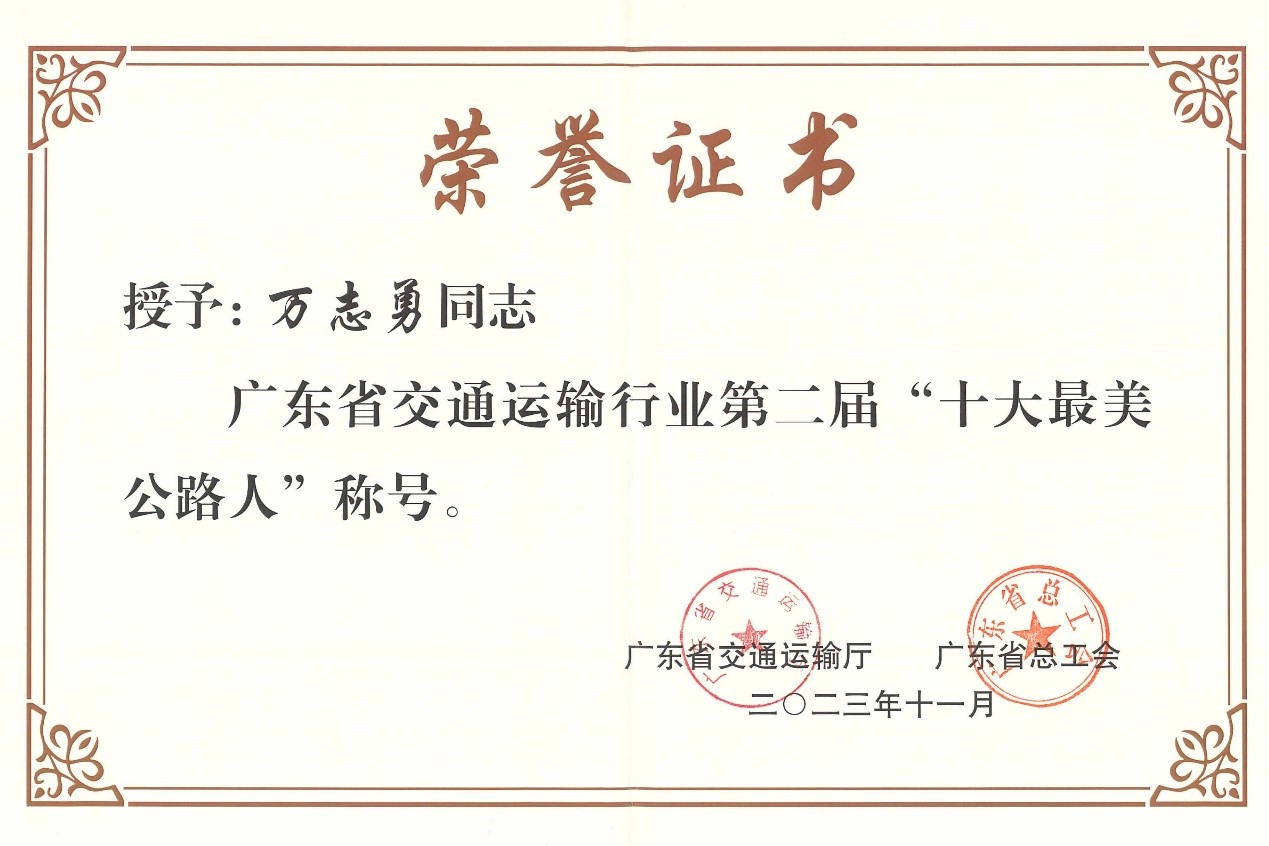 為大力弘揚(yáng)新時(shí)代交通精神,展示中國(guó)式現(xiàn)代化開路先鋒的良好風(fēng)采,發(fā)掘宣傳公路交通行業(yè)“最美”典型,加快建設(shè)交通強(qiáng)國(guó)先行示范省,近期廣東省交通運(yùn)輸廳、省總工會(huì)聯(lián)合組織開展了第二屆“最美公路人”推選宣傳活動(dòng),公司副總工程師萬(wàn)志勇喜獲廣東省交通運(yùn)輸廳授予“廣東交通運(yùn)輸系統(tǒng)第二屆‘十大最美公路人’”榮譽(yù)稱號(hào)。
