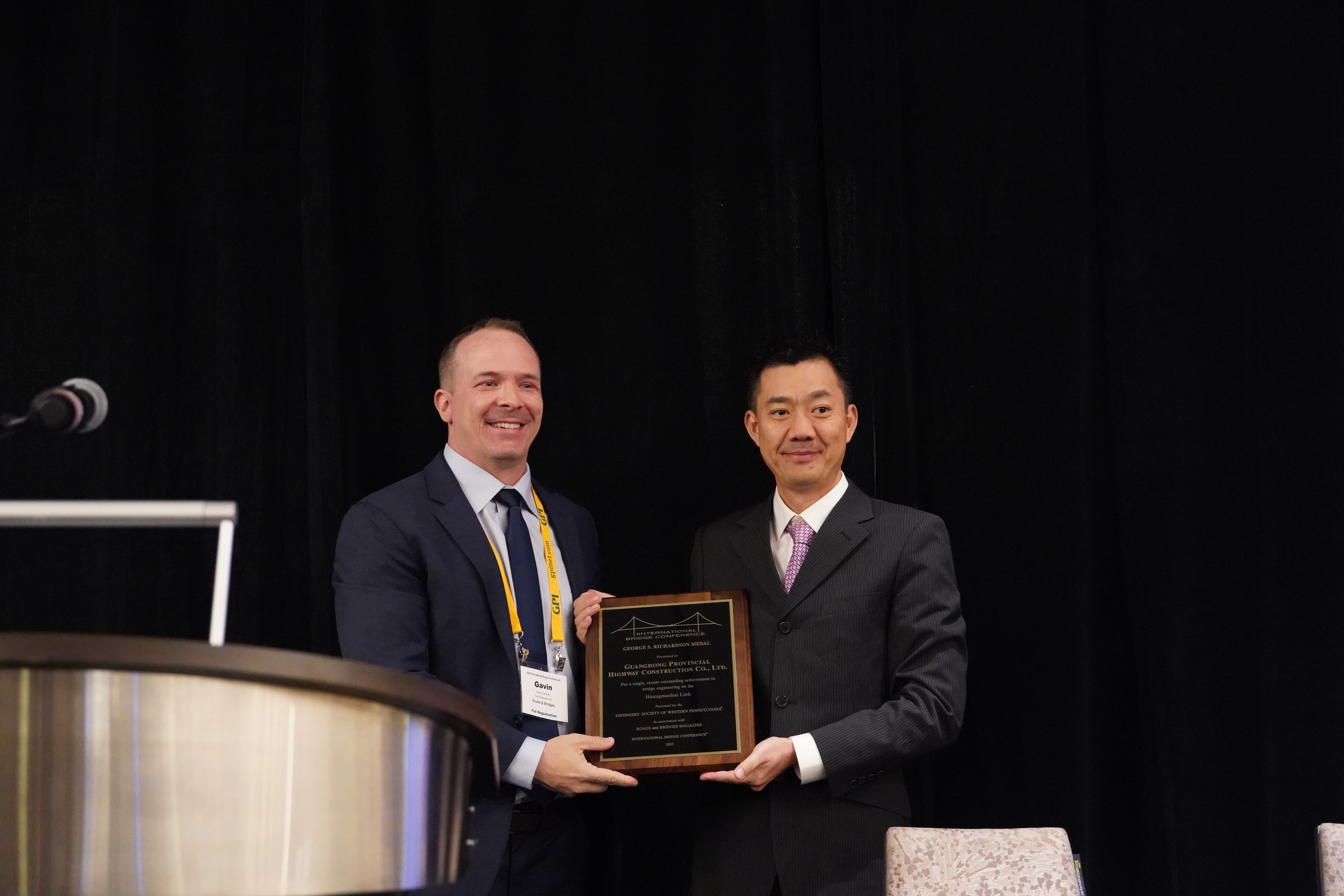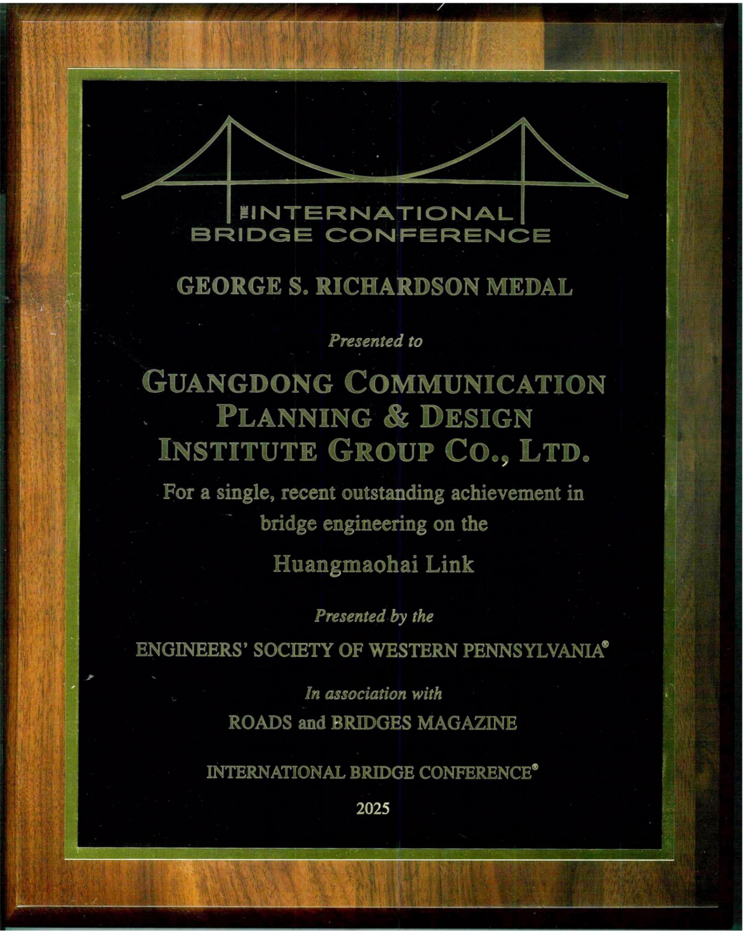 近日,公司承擔(dān)的黃茅??绾Mǖ理?xiàng)目榮獲2025年喬治?理查德森獎(jiǎng)(GeorgeS.Richardson Medal),成為本屆我國(guó)唯一獲此殊榮的項(xiàng)目。作為獲獎(jiǎng)單位,公司受邀參加了2025年7月14日-16日(美國(guó)當(dāng)?shù)貢r(shí)間)在賓夕法尼亞匹茲堡舉行的第42屆國(guó)際橋梁大會(huì)(International Bridge Conference,簡(jiǎn)稱IBC),公司第四設(shè)計(jì)院總工程師徐德志作為公司代表參加了大會(huì)并領(lǐng)取了獎(jiǎng)項(xiàng)。