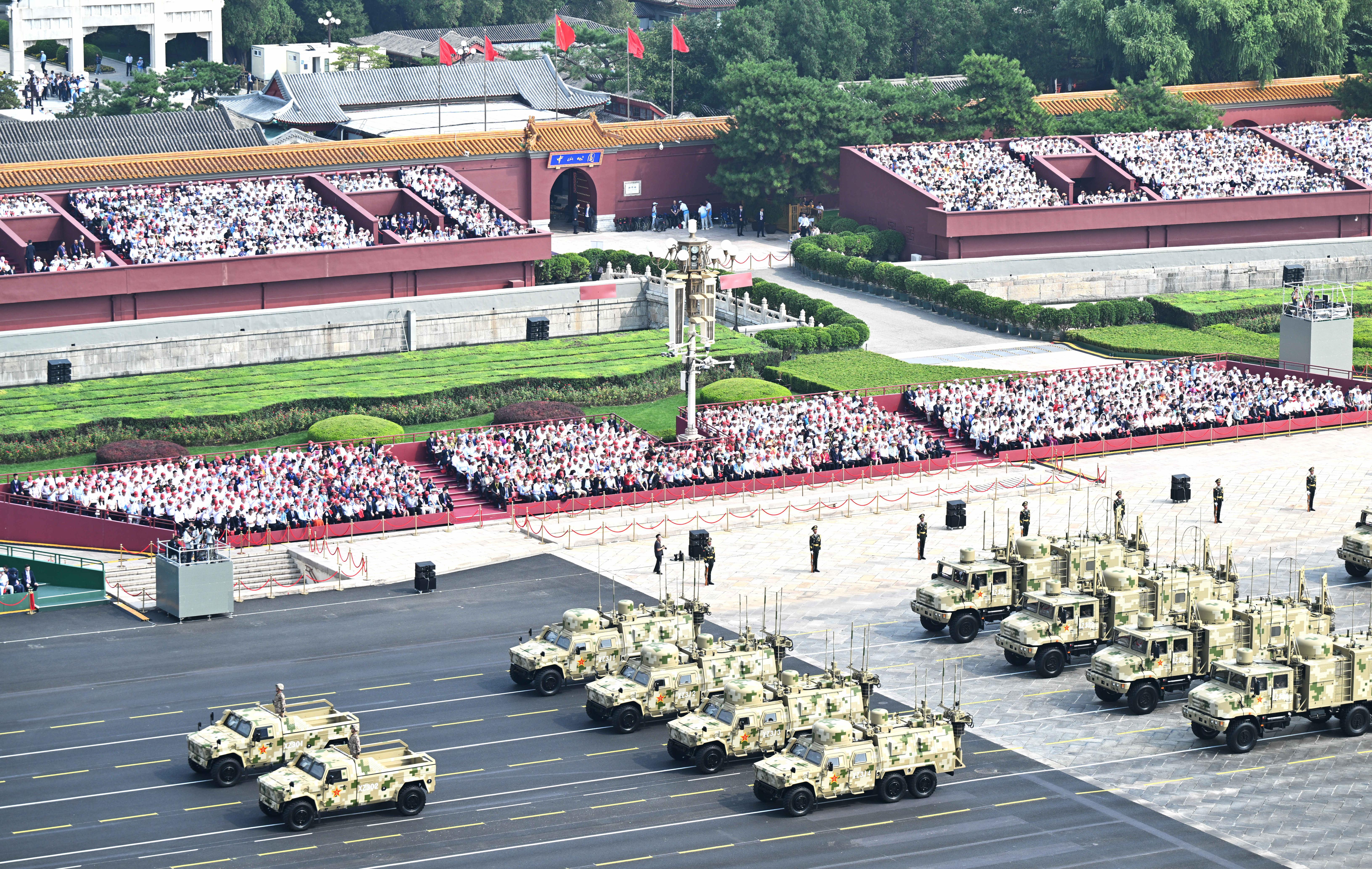此次閱兵編設(shè)45個方(梯)隊,包括空中護旗梯隊、徒步方隊、戰(zhàn)旗方隊、裝備方隊、空中梯隊等,展現(xiàn)了部隊的實戰(zhàn)化特點。其中,軍事航天部隊、網(wǎng)絡(luò)空間部隊、信息支援部隊、聯(lián)勤保障部隊等戰(zhàn)略兵種首次集中亮相。裝備方隊中還展示了無人、水下、網(wǎng)電等新型作戰(zhàn)力量群,以及部分陸海空基戰(zhàn)略重器和高超精打裝備。他們威武雄壯地通過天安門,接受黨和人民的檢閱,吸引了全世界的目光。